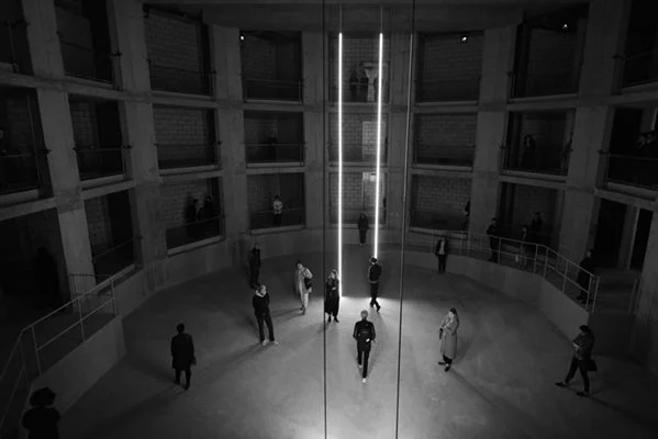 We leave the busy sounds of Essex Road while dusk is still falling. The audience is led to the third floor of a barren cathedral space with a blue-tinted skylight. Peering below, we see an empty space with ramps leading to the centre. Each ramp has thin LED lighting creating an entrance and focus in the increasing darkness. Before we can consider its purpose we hear the deep bass of drum beats as performers enter the space in twos and threes, eventually disappearing into recesses on all three floors. Sounds of chanting begins to emerge from unseen corners. The sounds layer over each other and bounce off the cement walls.